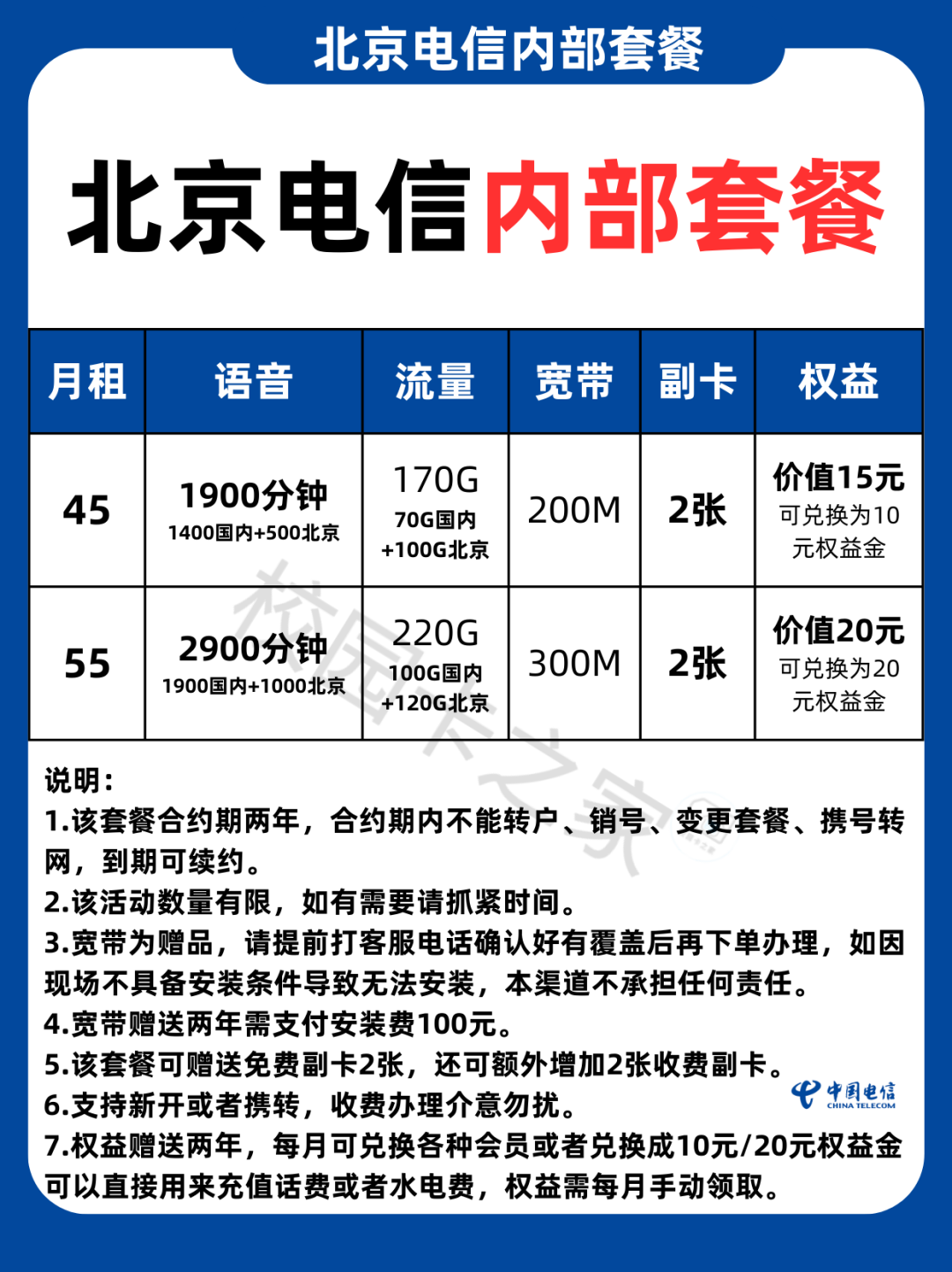 • 55元套餐:220G流量(国内100G+北京120G)比45元套餐多50G,且宽带从200M升级至300M,网速更快,适合多设备家庭或高清视频用户。
