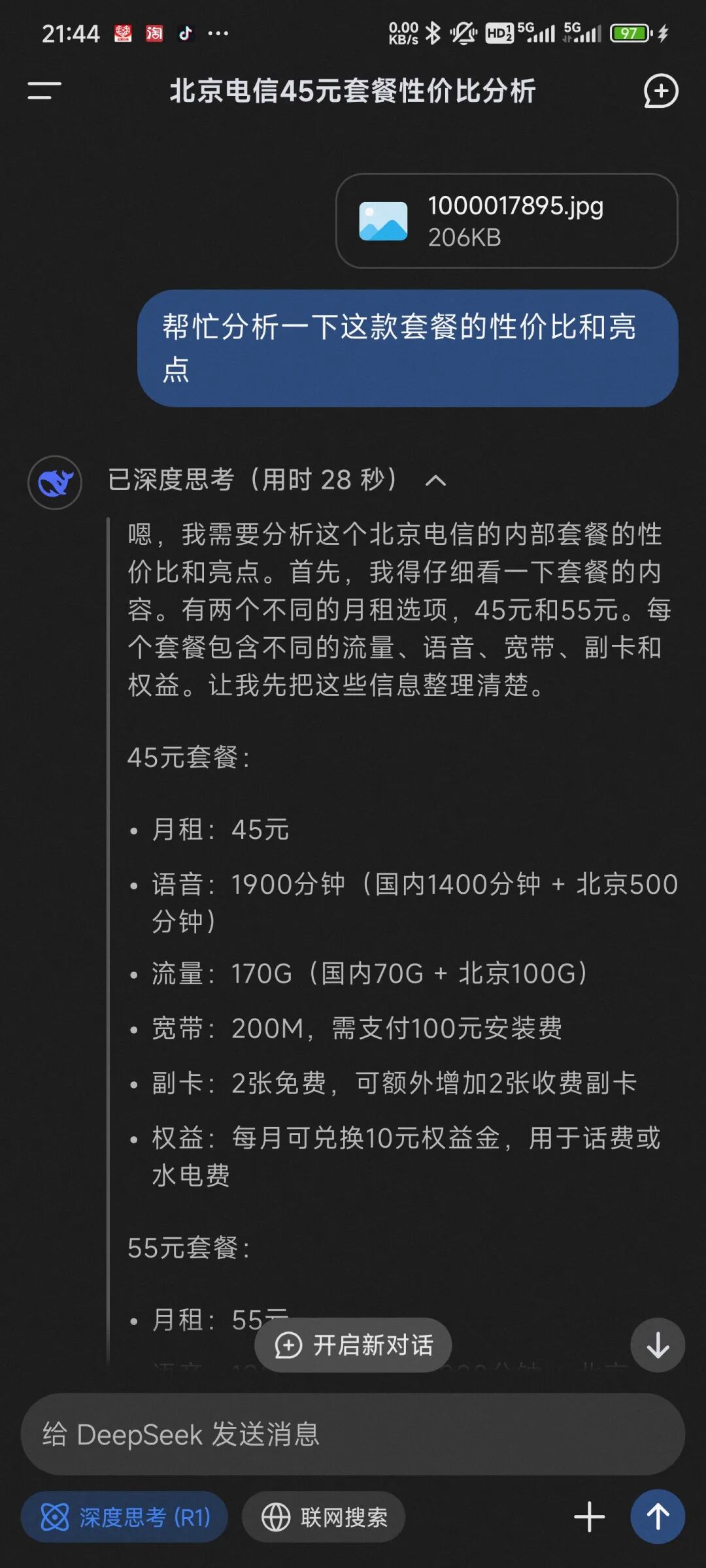 北京电信内部套餐性价比及亮点分析(DeepSeek深度思考版)