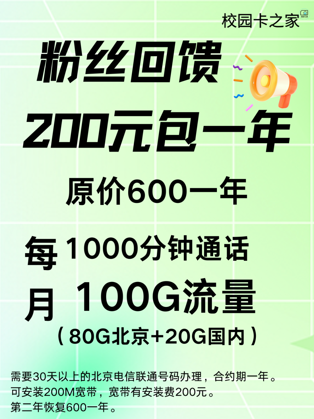 原价600一年畅享套餐,每月包含1000分钟通话+100G流量,还可以200M宽带(宽带额外有200元安装费需要自理)。比去年的活动套餐内容翻了一番,简直就是北京电信联通老用户的不可错过的超值活动。