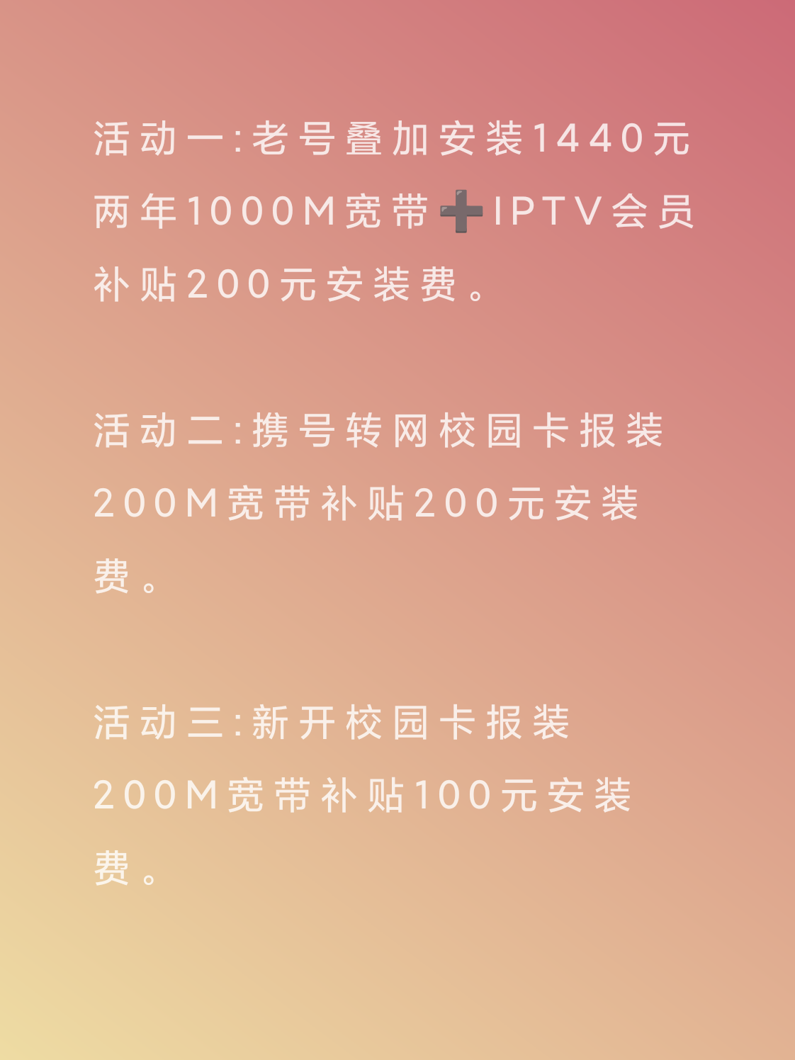1.老号叠加1440元两年1000M宽带赠送FTTR设备+IPTV,本月补贴200元安装费,宽带费用可以直接按月开到话费发票里,不体现宽带费用,非常适合有公司报销话费的用户。