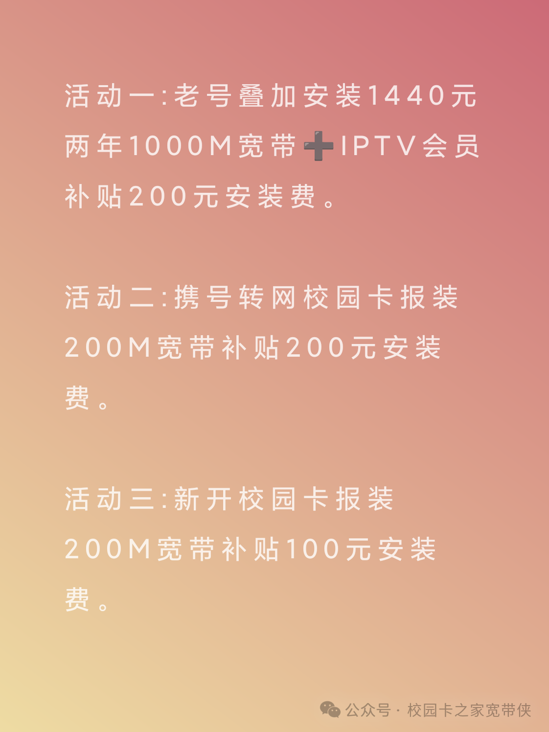 3.新开校园卡报装200M宽带补贴100元安装费。