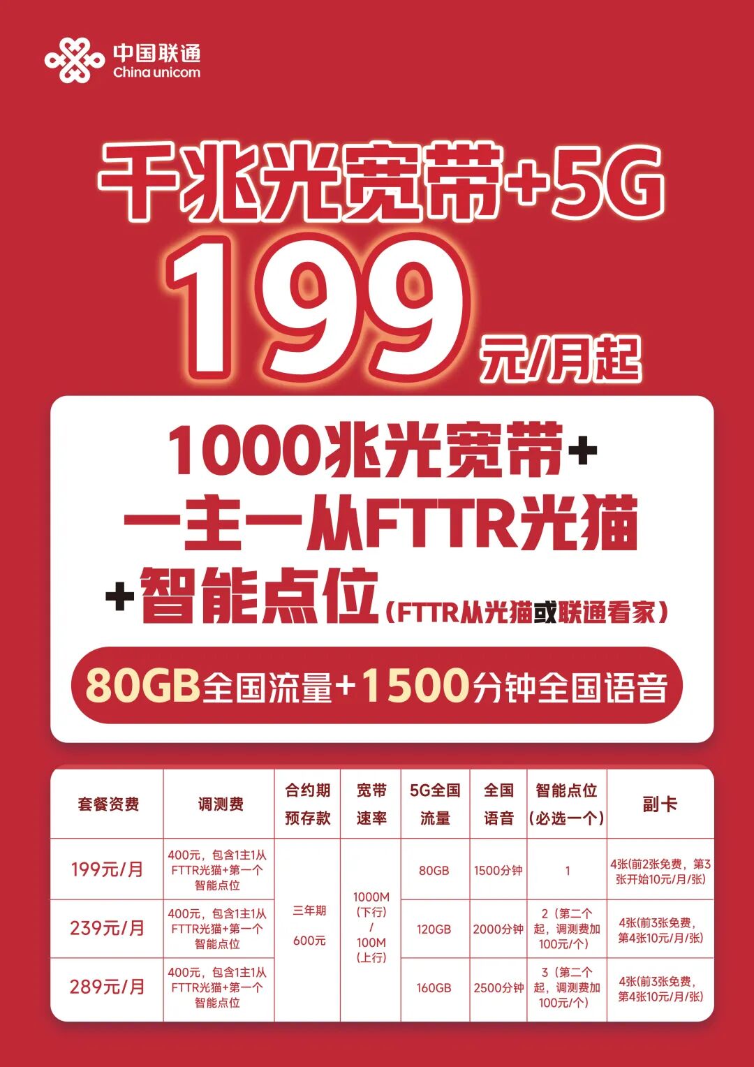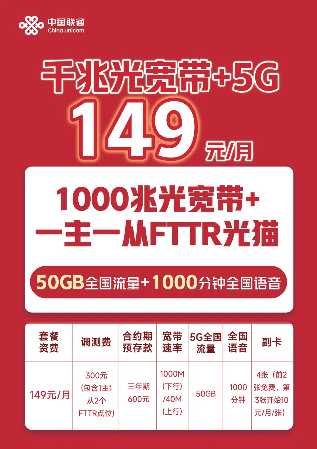 149月租1000M FTTR宽带,包含50G流量和1000分钟通话,可绑定4张副卡,前两张免费,第三张开始10元/月/张,同时绑定第三张副卡后可享受流量翻倍福利。注意:这几款都是3年合约,还有预存话费的要求,联通一般都是高额违约金!