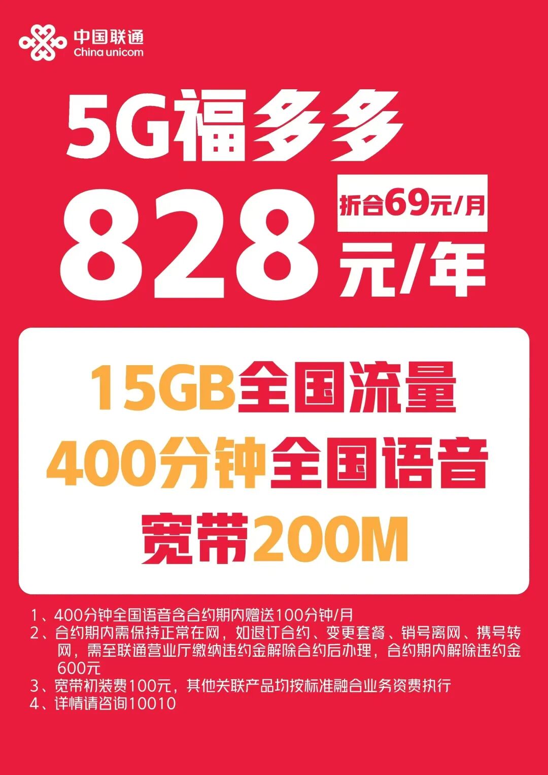 福多多828包年套餐,每月400分钟通话+15G国内流量+200M宽带,宽带安装费100元,月均69元,这个比营业厅115元300M的性价比要高很多,200M和300M使用起来体验上几乎没区别。