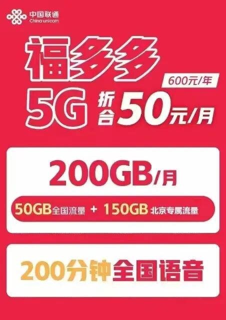 首先出场的是北京联通600一年,每月200G流量(50G国内+150G北京流量)+200分钟通话,这个是一年的合约可以新开可以携转。大流量+通话,不带宽带。