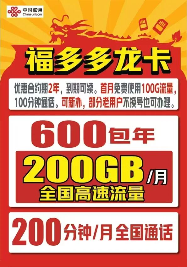 这一款同样也是600一年,价格没区别。区别在于200G流量全部是国内流量,通话也是200分钟全国。还有一个最大的区别就是这个是两年的合约,也就是说第二年必须充值600再续约一年,不能提前解约,否则会面临高额违约金。可开新号可携号转网,目前不支持副卡。