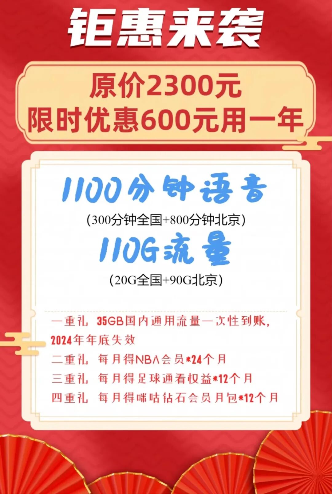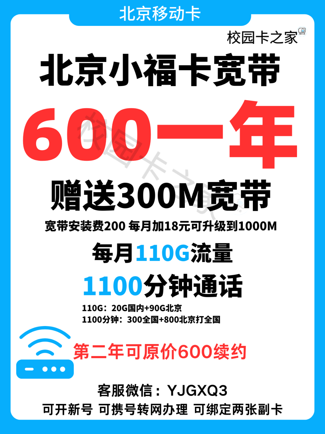 套餐原价1188元,优惠后600一年(第二年可600一年续约),每月110G流量+1100分钟通话+300M宽带。