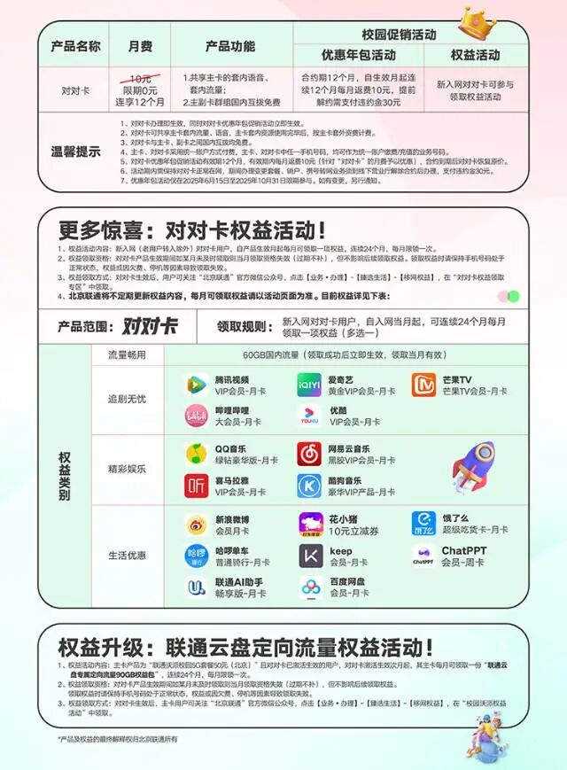 二、北京联通校园卡副卡(对对卡):娱乐权益专精,年省200-400元